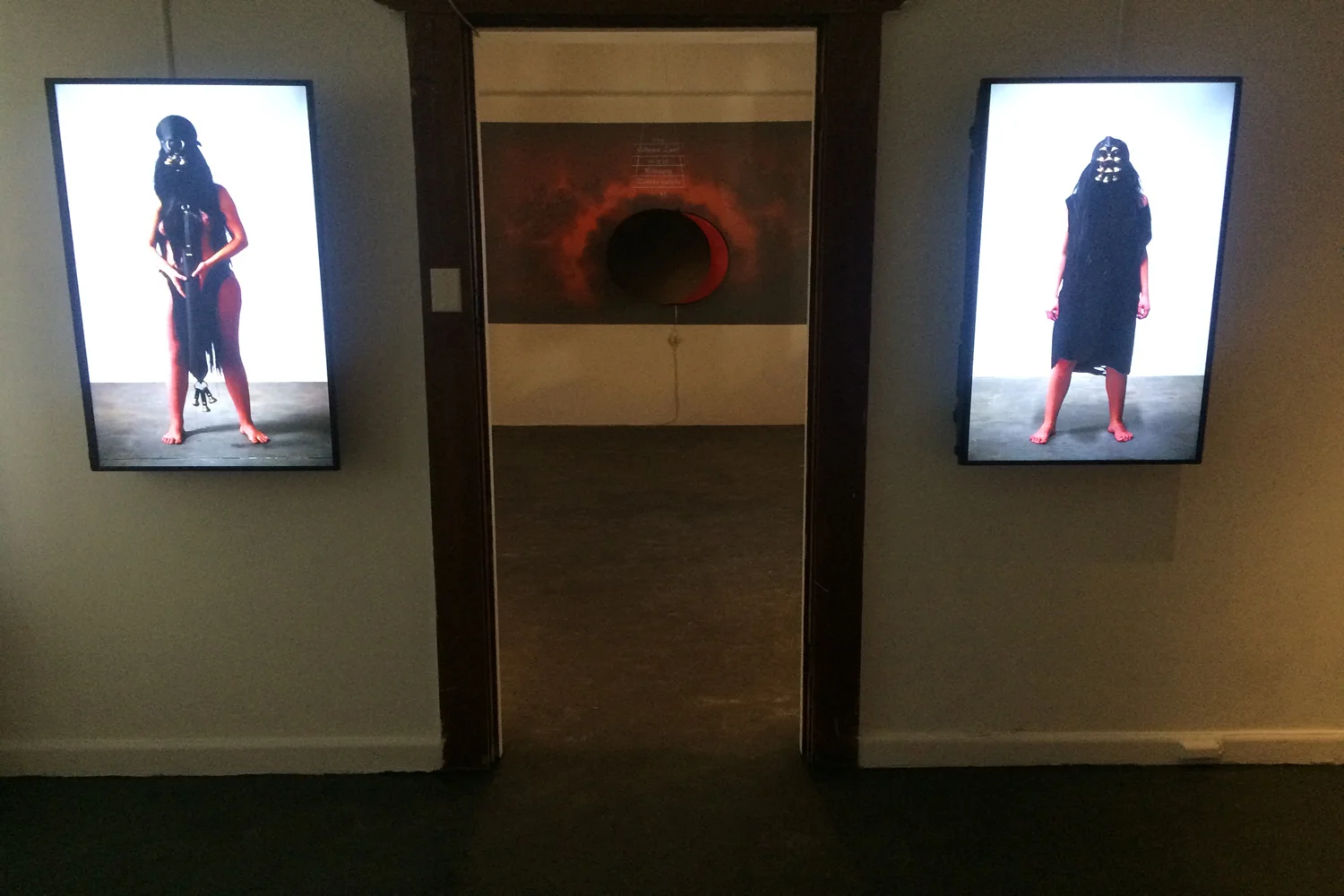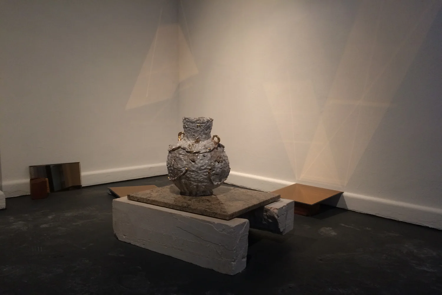 As one enters BLINDSIDE they are greeted with their mirror self; a ghost sculpture collapses upon itself; a monumental wall becomes a gateway between interior and exterior worlds; punctured vessels carry and seep energy from other times and places; the contemporary figure of the witch demolishes and rebuilds gender hierarchies; a corner of reflective discs perpetually shifts architecture; Jungian archetypes glow, smoke and smoulder; and a live eclipse interrogates colonial forecasts. All the while the internal structure of the gallery becomes a haunting acoustic, where a spirit box channels voices beyond the walls.