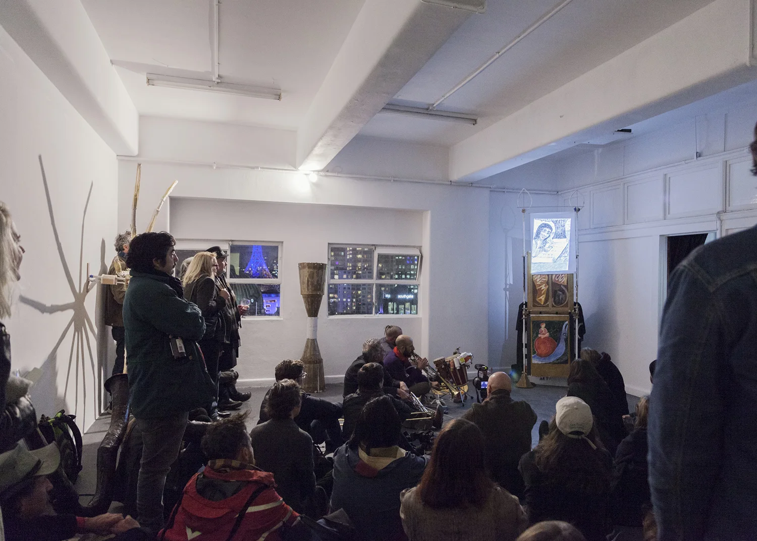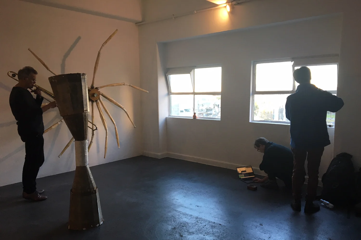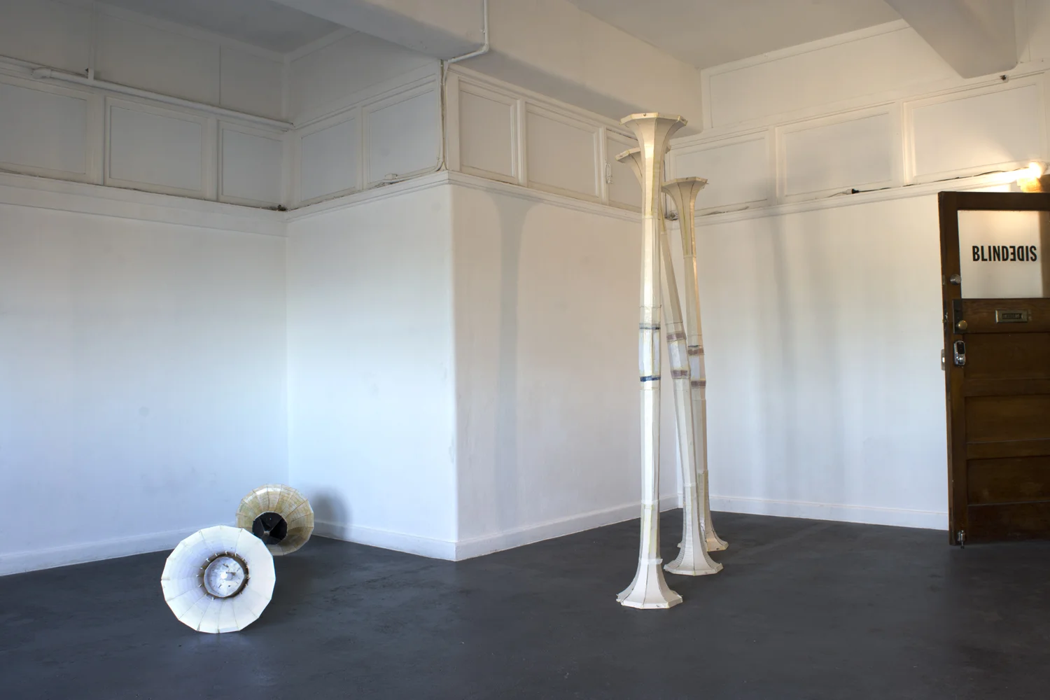 BLINDSIDE stands upon stolen, never ceded Wurundjeri land – a genocidal landscape with its own wind of shades, of ghosts, of voices lost or never heard. Crewdson's other sound sculptures – a ‘Rice Wheel’ and ‘Galileo Drum’ – generate sound through gravity-produced falling motion, thereby also acknowledging the Wurundjeri ground upon which the gallery and surrounding city, stand.