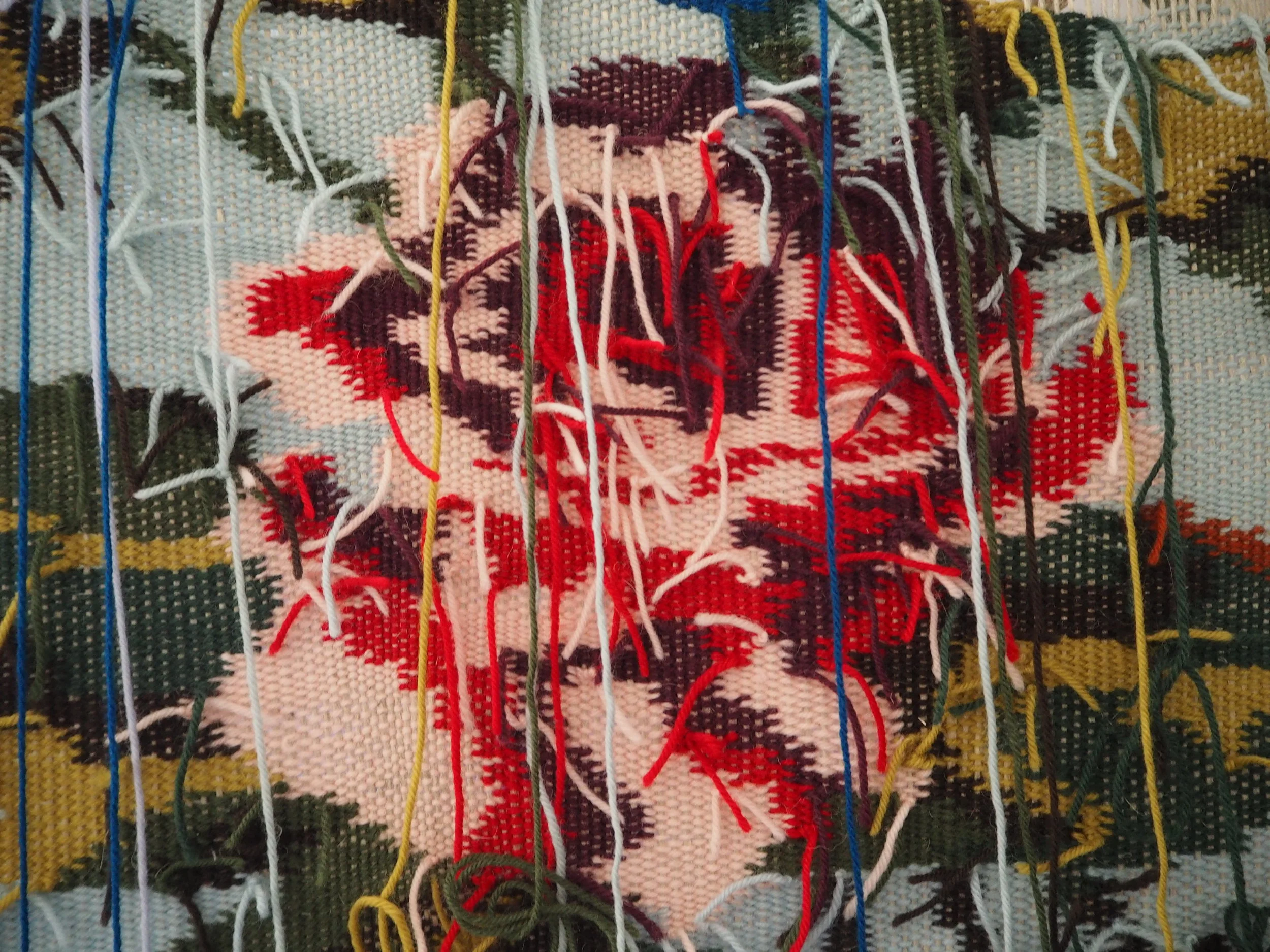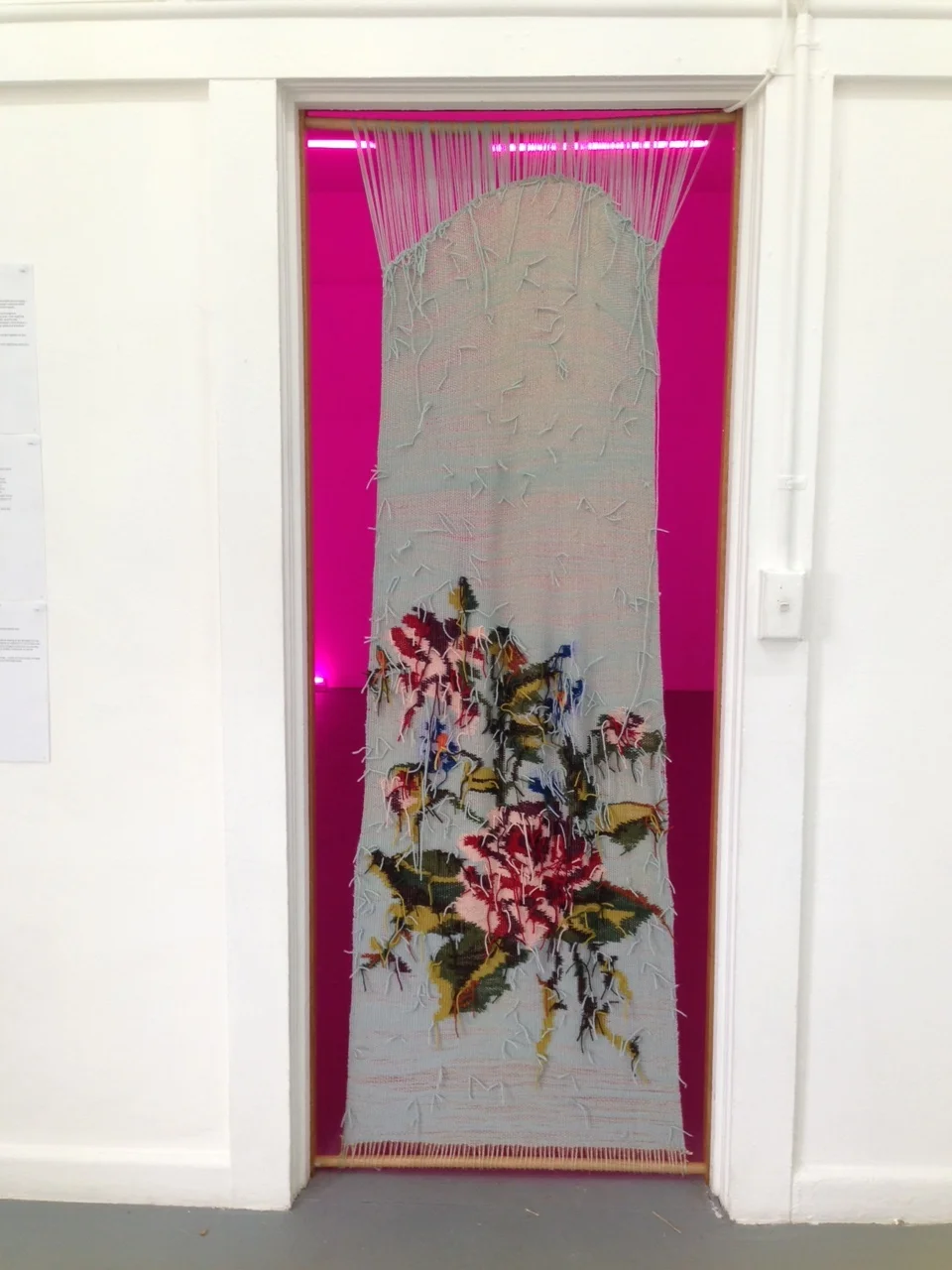 Sub Rosa Enclosure is an experiment with the performativity of space through its alteration. The woven curtain forbids access to the gallery, but, by displaying the ‘wrong’ side of the work, the artist hints to the viewers that there is something inside to be seen. This is a work that provokes the curiosity of the viewer, drawing them closer to see, but thwarting them as they attempt to do so.